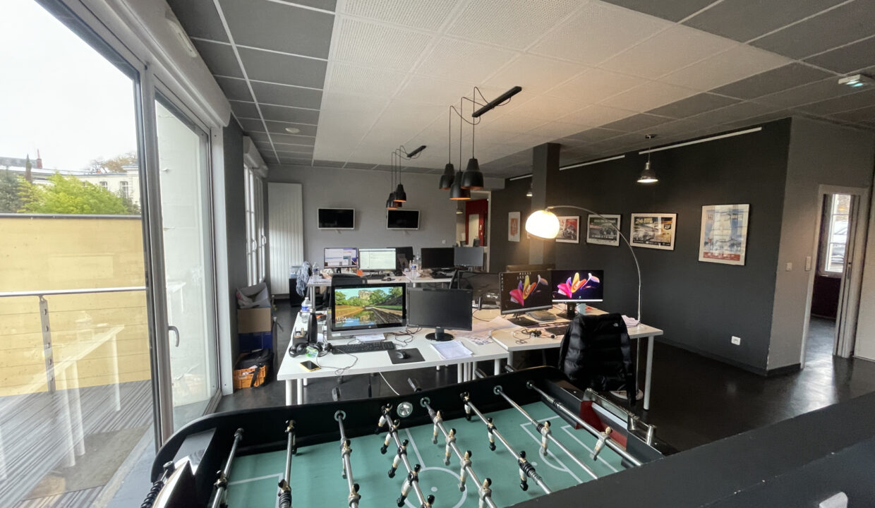1er étage avec un open space, 1 bureau fermé, des sanitaires avec 2 WC, un grand bureau avec cuisine aménagée équipée.