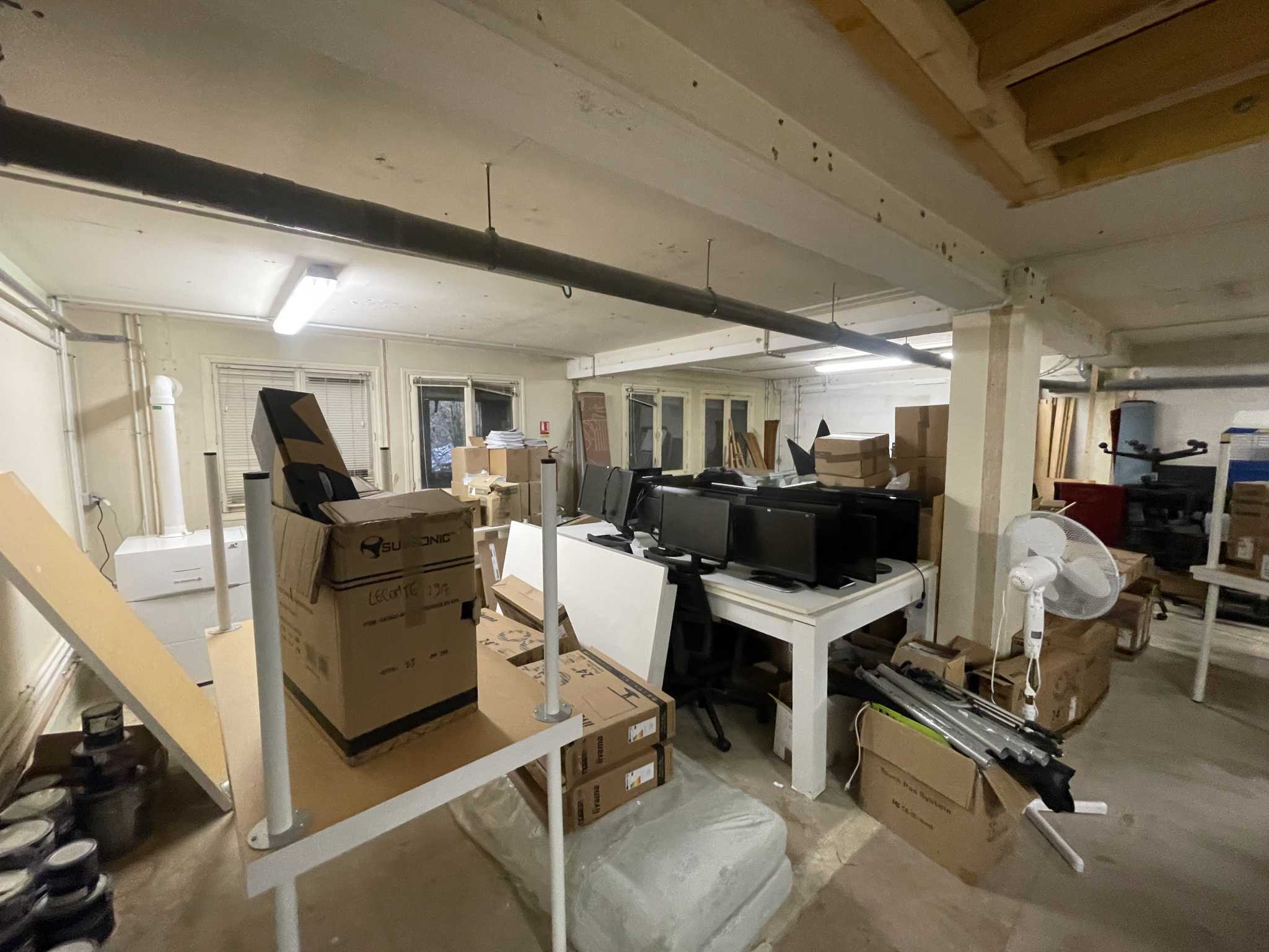 Un Sous-sol avec 1 salle sécurisée pour baie informatique,1 salle de d’archive, 1 garage pouvant accueillir 2 voitures. Possibilité de stationner 4 véhicules en tout.